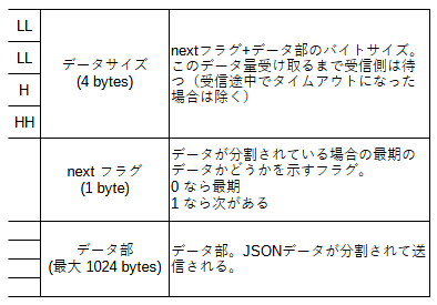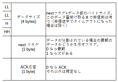 これだと受信側で終わりがわからないので、データフォーマットを以下のようにしています。